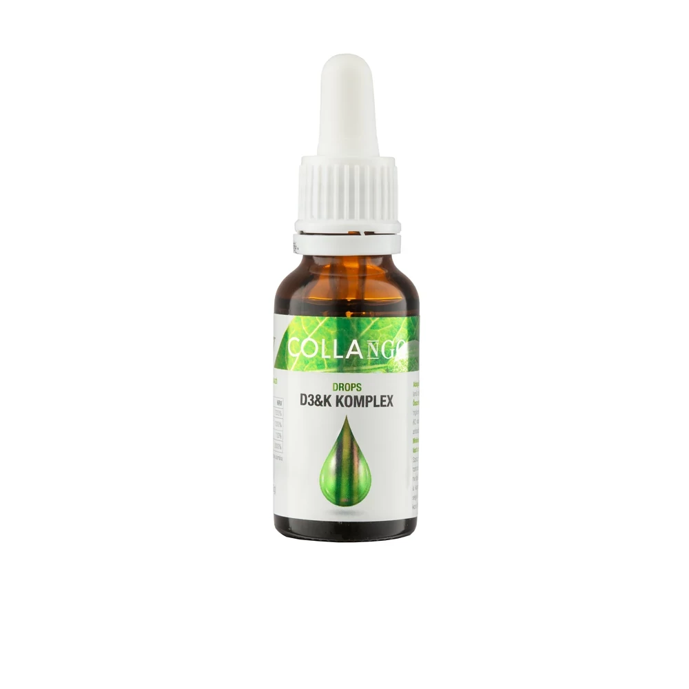 A Collango Drops D3+K Komplex egy nagy dózisú vitamin készítmény. Kiváló minőségű DSM D3-vitamin (https://www.dsm.com/human-nutrition/en/products/vitamins/vitamin-d.html), alga eredetű D3-vitamin (vegan) (https://www.vitamind3v.com)keverékéből, gyógyszerkönyvi minőségű K1-vitaminból (https://www.dsm.com/human-nutrition/en/products/vitamins/vitamin-k.html) és teljesen természetes, biotranszformációval előállított vegan K2-vitaminból áll (https://www.vitamk7.com/) melyet vegyes tokoferolokkal (E-vitamin) stabilizáltunk. Mindez feloldva RSPO minősített MCT (közepes szénláncú zsírsavak trigliceridjei) olajban feloldva. Ez azért fontos, mert fenntartható gazdálkodásból származik és így közösen megőrizhetjük a vadon élő állatfajok élőhelyeit.